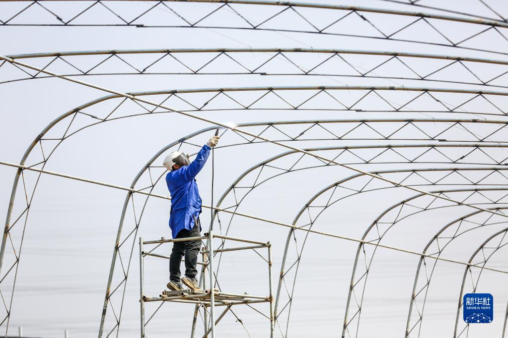 2月20日,工人在瑞昌市赛湖农场三分场建设智慧大棚。