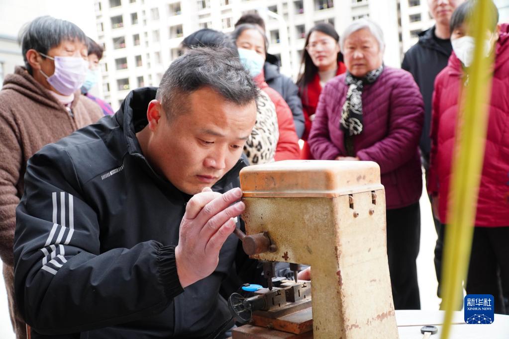 2月21日,在山东省成武县文亭街道万福城小区,配钥匙师傅邵珠超在为小区居民服务。