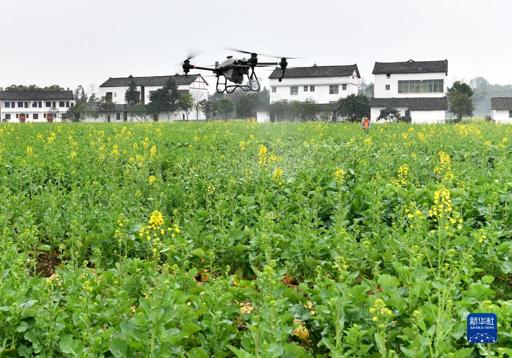 2月21日,在四川省广安市广安区花桥镇花桥村,农户操作植保无人机给油菜施肥。
