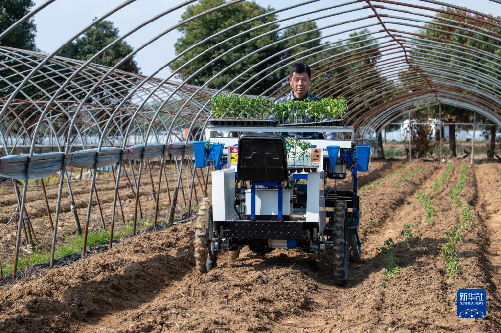 2月21日,在浙江省金华市婺城区白龙桥镇董村辣椒基地,农民在田间操控蔬菜移栽机。