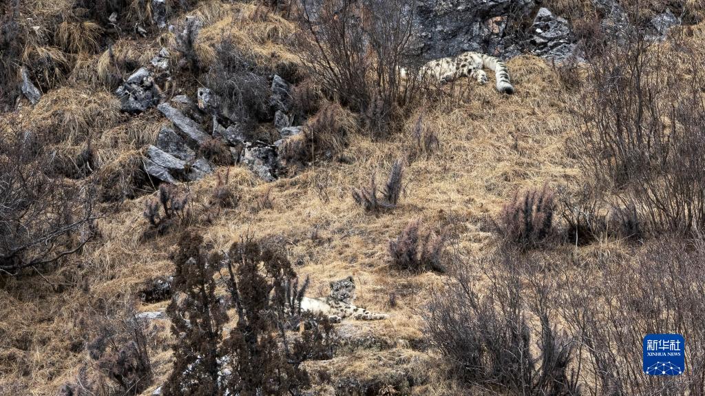 2月21日,在青海省玉树藏族自治州杂多县昂赛乡境内的昂赛大峡谷内,两只雪豹正在休息。