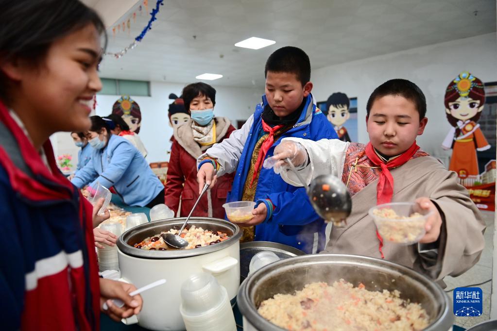 2月21日,在西安市浐灞第一中学举行的藏历新年团拜活动上,学生品尝特色小吃。