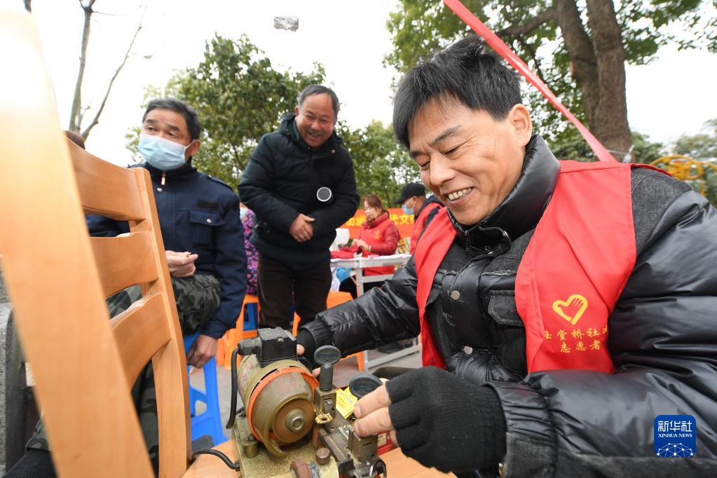2月22日,浙江省湖州市,锁匠刘寿涛在志愿服务站为群众配钥匙。