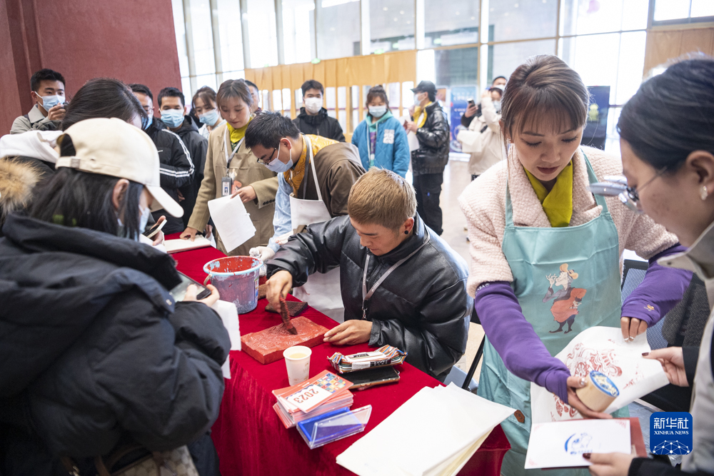 2月22日,西藏博物馆工作人员为游客制作带有“吉祥八宝”“扎西德勒”等图案和文字的木刻印刷品。