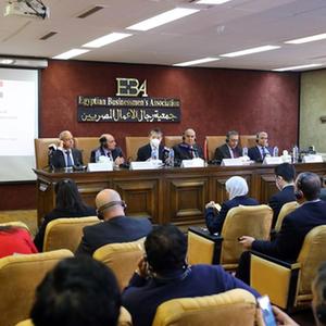 这是2月20日在埃及开罗拍摄的中埃企业家研讨会现场。