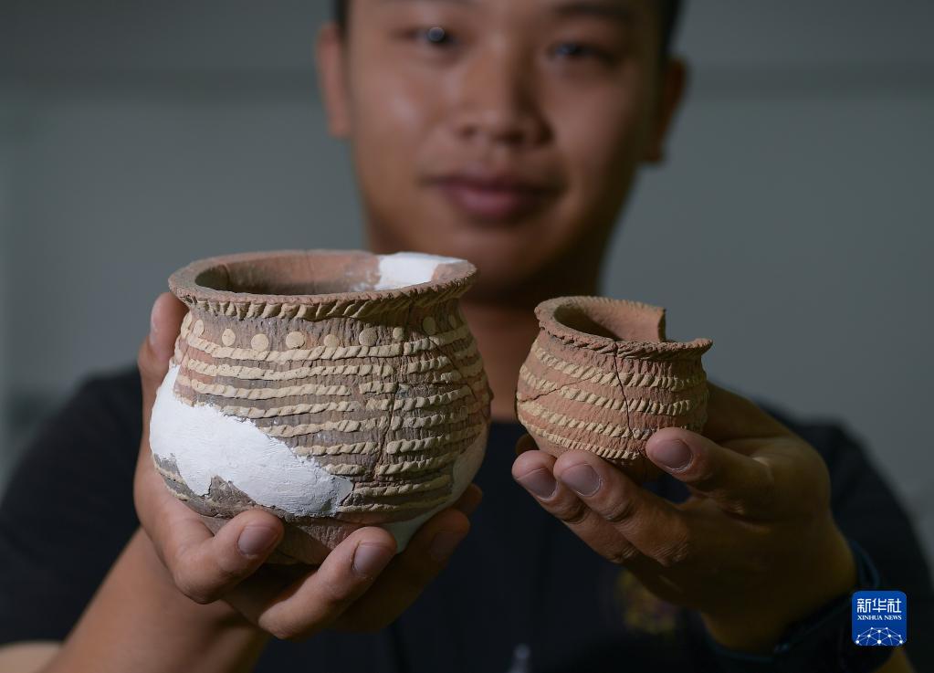 考古工作人员展示甘肃庆阳市南佐新石器时代遗址内出土的箍白泥附加堆纹夹砂陶罐(2022年8月25日摄)。