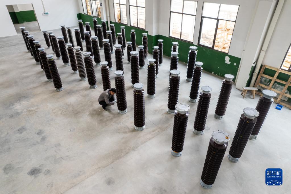 2月22日,在位于醴陵市的湖南阳东电瓷电气股份有限公司生产车间,工作人员在检查瓷绝缘子质量(无人机照片)。