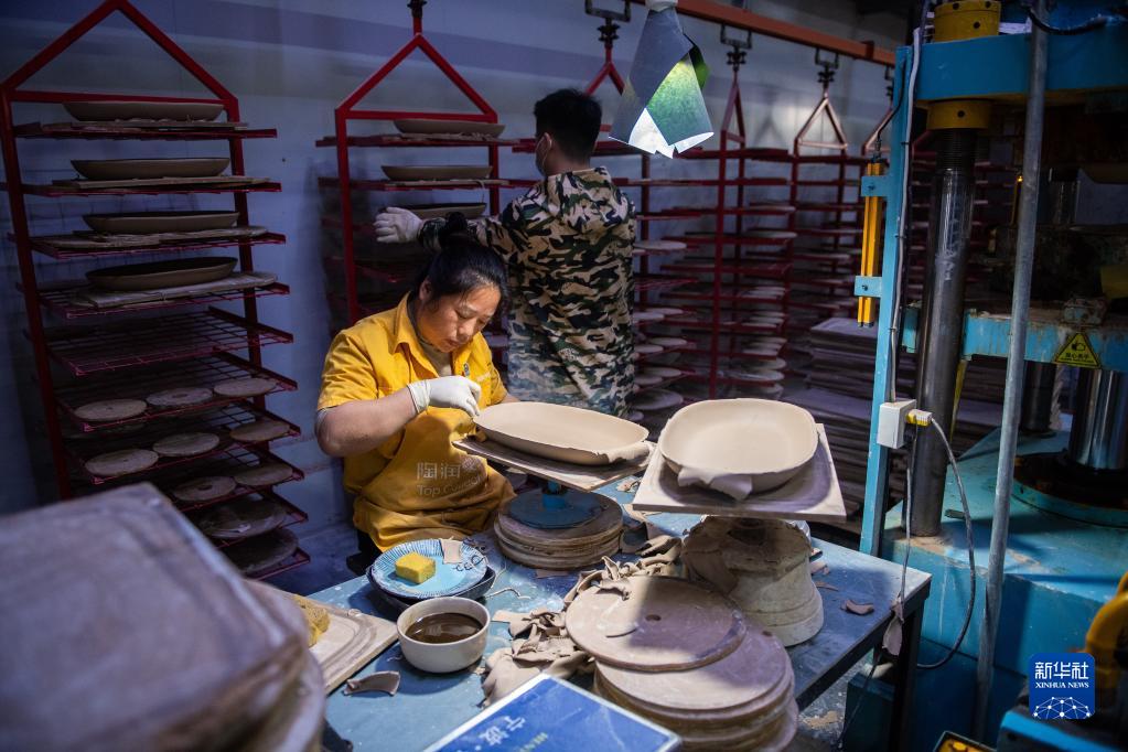 2月22日,在醴陵陶润实业发展有限公司生产车间,工作人员在手工制作异形瓷器。
