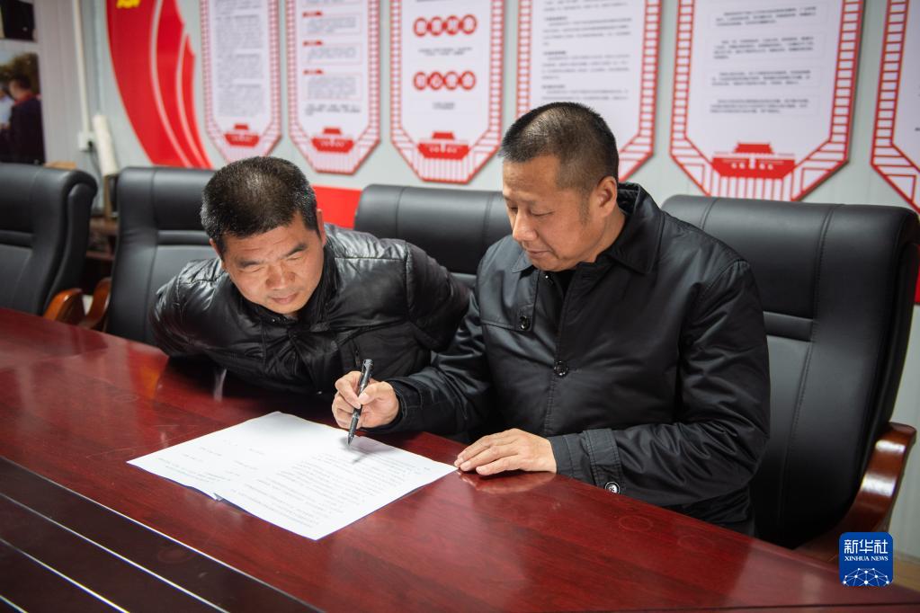 2月9日,在益阳明天农业科技有限公司,负责人姚清明(右)向益阳市资阳区新桥河镇廖河村村民李志强讲解“十代服务”合同书。新华社记者 周勉 摄