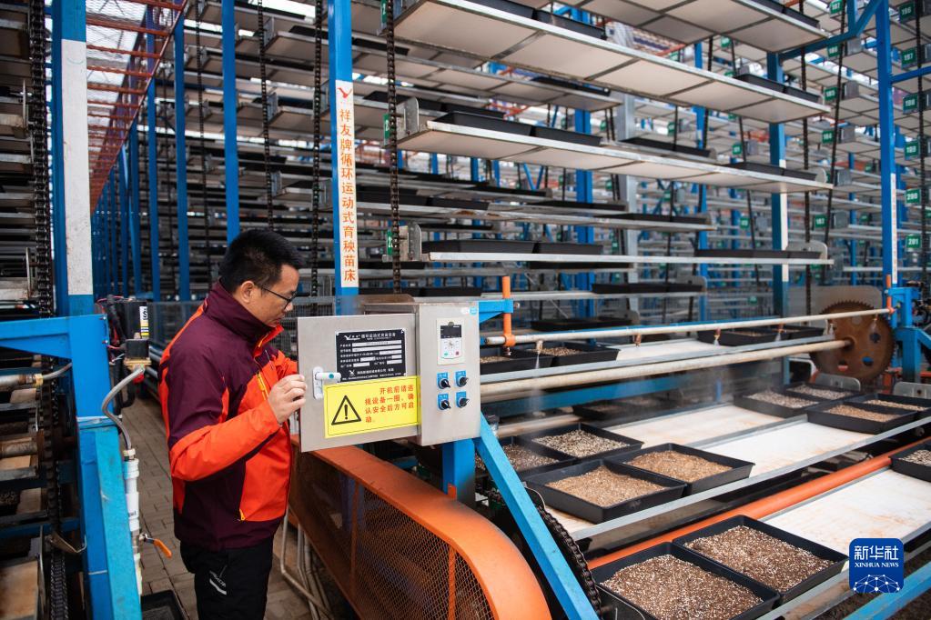 2月9日,湖南江南生态农业科技开发有限公司负责人薛永强在位于益阳市赫山区兰溪镇苏家湖村的育秧工厂调试苗床。新华社记者 陈思汗 摄