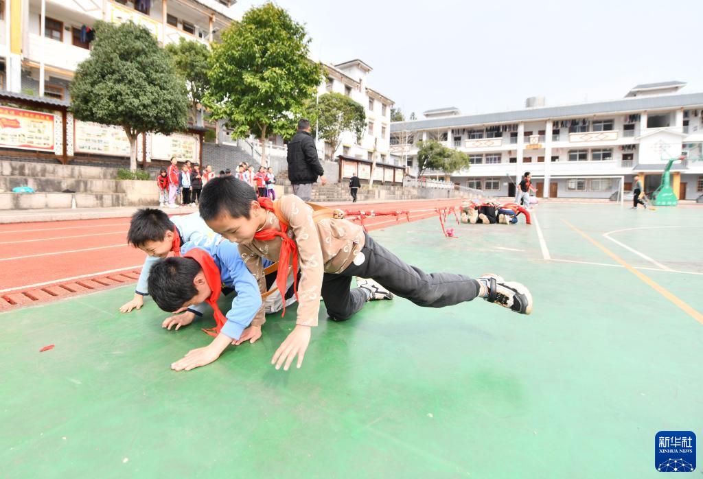 2月22日,广西蒙山县夏宜民族学校学生在体育课上进行“大象拔河”。