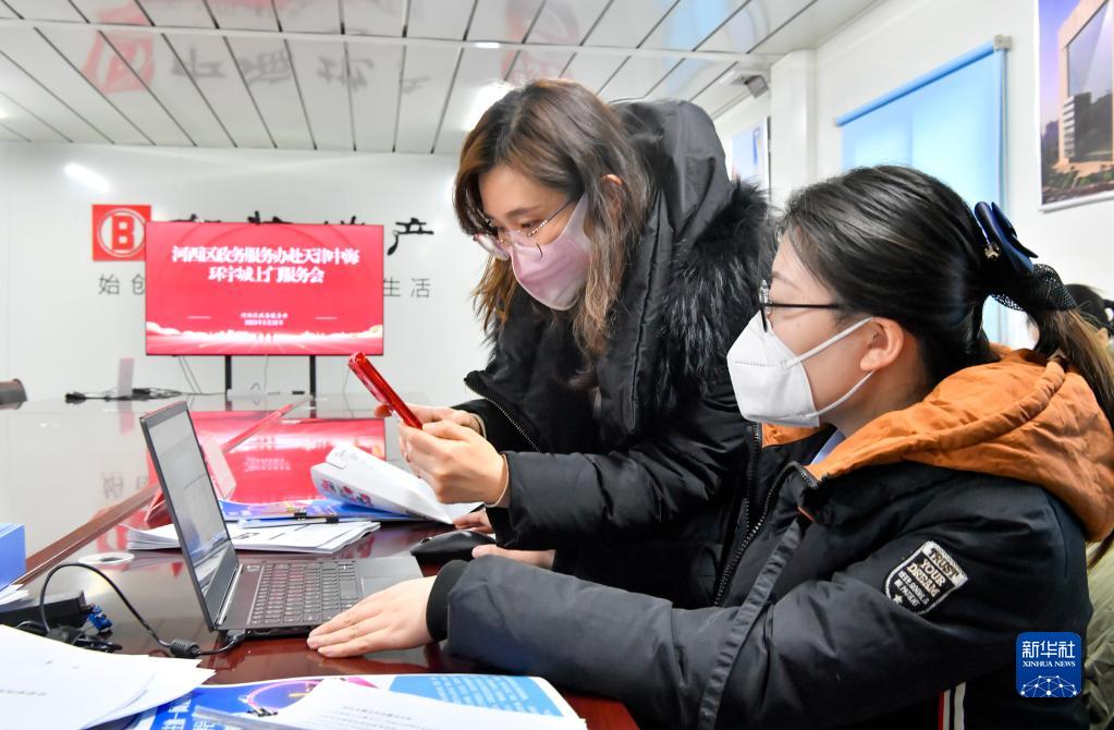2月22日,在天津市河西区中海环宇城临时办公点,天津市河西区政务服务办公室工作人员为服务业商户办理营业执照审批。