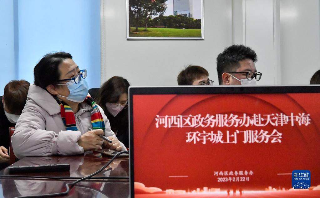 2月22日,在天津市河西区中海环宇城临时办公点,服务业商户代表在现场听取讲解。