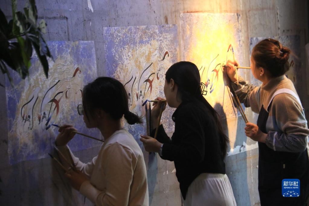 2月22日,在敦煌小镇鸣沙书院,学员学习敦煌壁画临摹技艺。