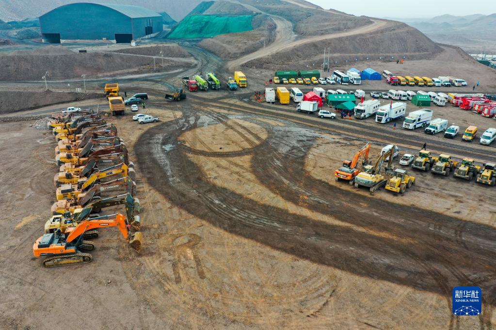 2月23日,救援车辆在内蒙古自治区阿拉善盟阿拉善左旗新井煤业有限公司露天煤矿坍塌事故现场附近待命(无人机照片)。