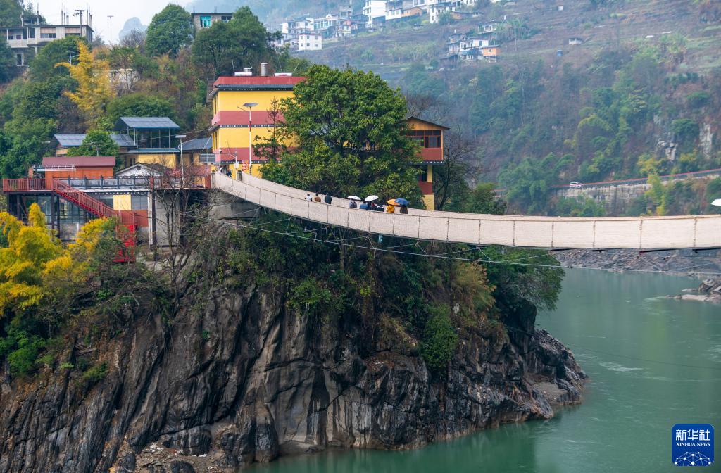 2月22日,游客通过架设在怒江上的吊桥进入云南省福贡县施底村秘境湾。