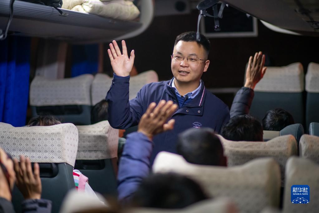 在云南省曲靖市麒麟区人力资源服务产业园内,袁海波与准备出发的务工人员道别(2月12日摄)。