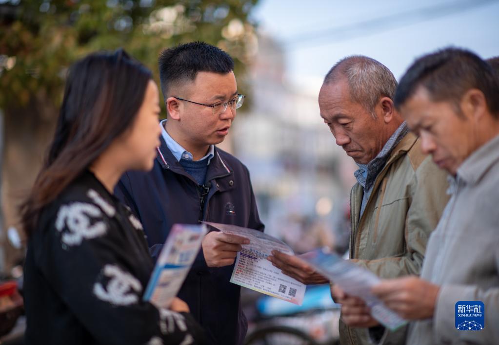 在云南省曲靖市,袁海波(左二)在人才市场向务工人员发放就业宣传单并介绍就业政策(2月12日摄)。