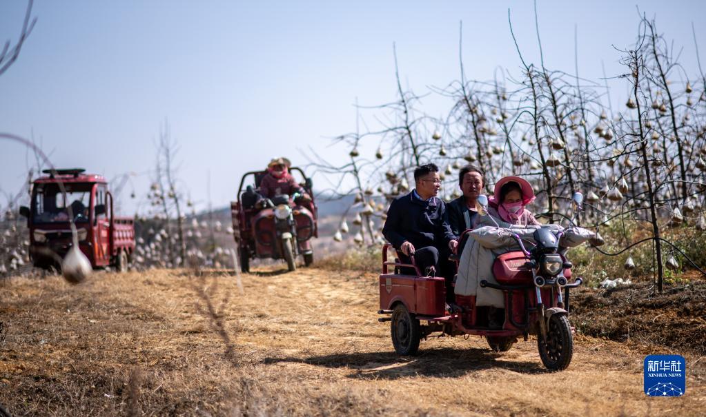 袁海波(右三)在云南省曲靖市马龙区一种植基地了解务工人员就业需求(2月11日摄)。