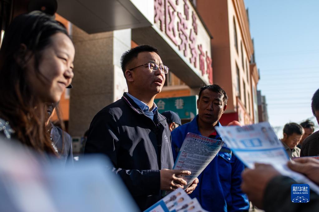 在云南省曲靖市,袁海波(左二)在人才市场向务工人员发放就业宣传单并介绍就业政策(2月12日摄)。