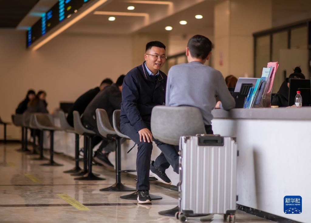 在云南省曲靖市麒麟区人力资源服务产业园,袁海波(左)向准备出发的务工人员了解就业需求(2月11日摄)。