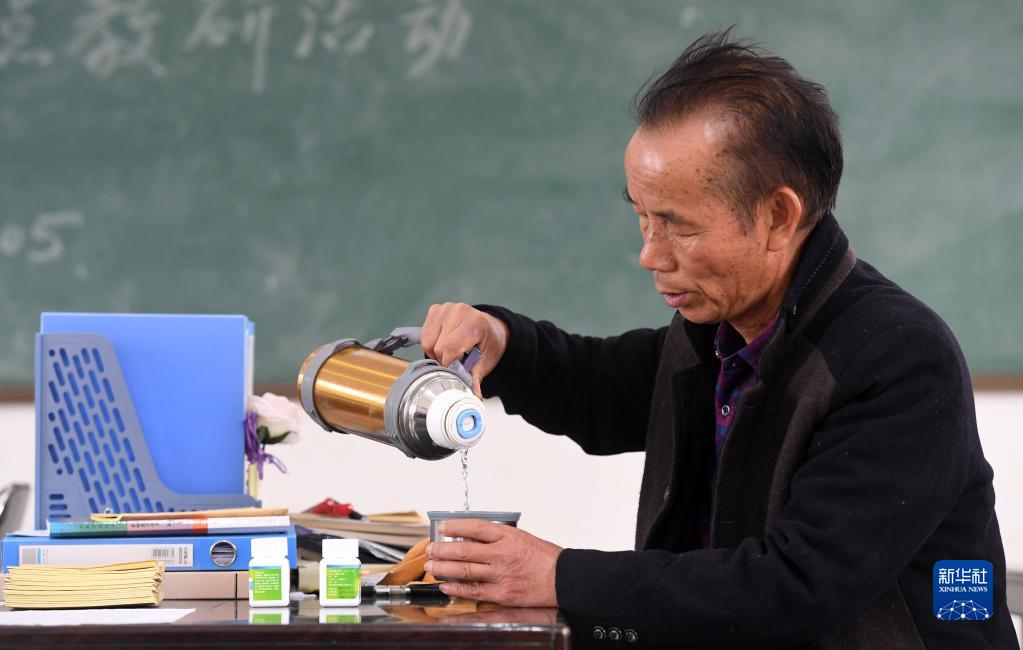 在广西宾阳县王灵镇中心学校七新教学点,王英红老师倒水准备吃药(2月22日摄)。