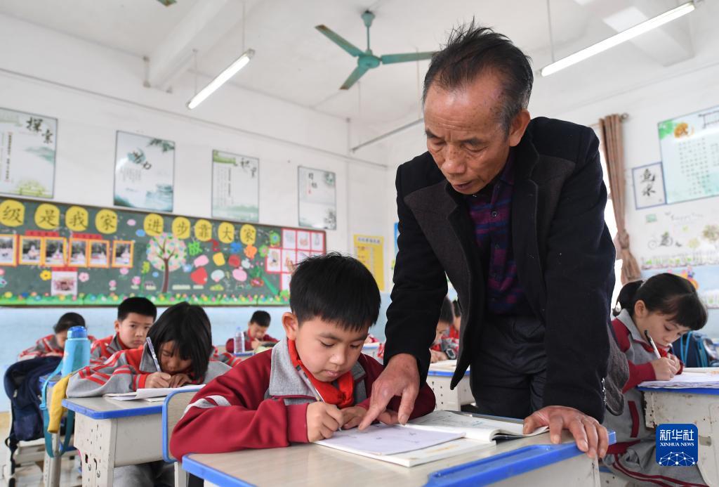 在广西宾阳县王灵镇中心学校七新教学点,王英红老师在课堂上辅导学生功课(2月22日摄)。