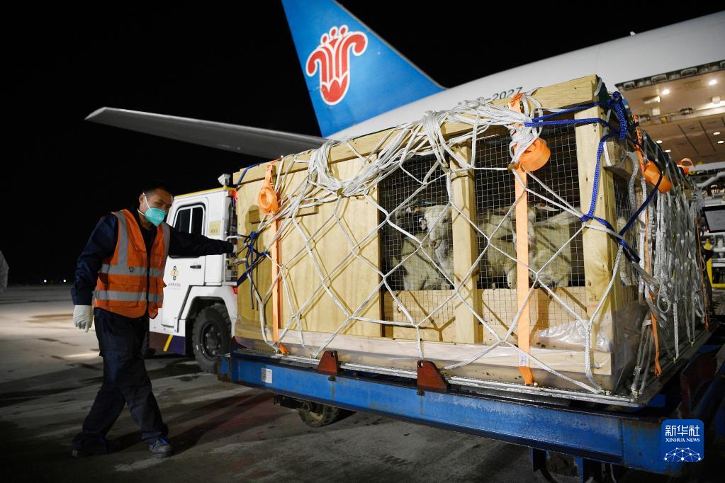 银川河东国际机场工作人员对种羊进行转运(2月22日摄)。