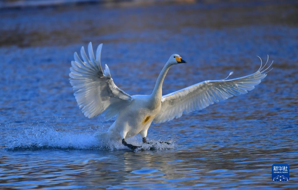 2月21日,在北票市八家子乡红村大凌河畔,天鹅在水面降落。