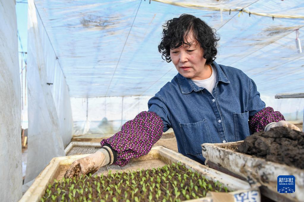 2月22日,农民李玉霞在吉林市永吉县北大湖镇五里河村移栽蔬菜苗。