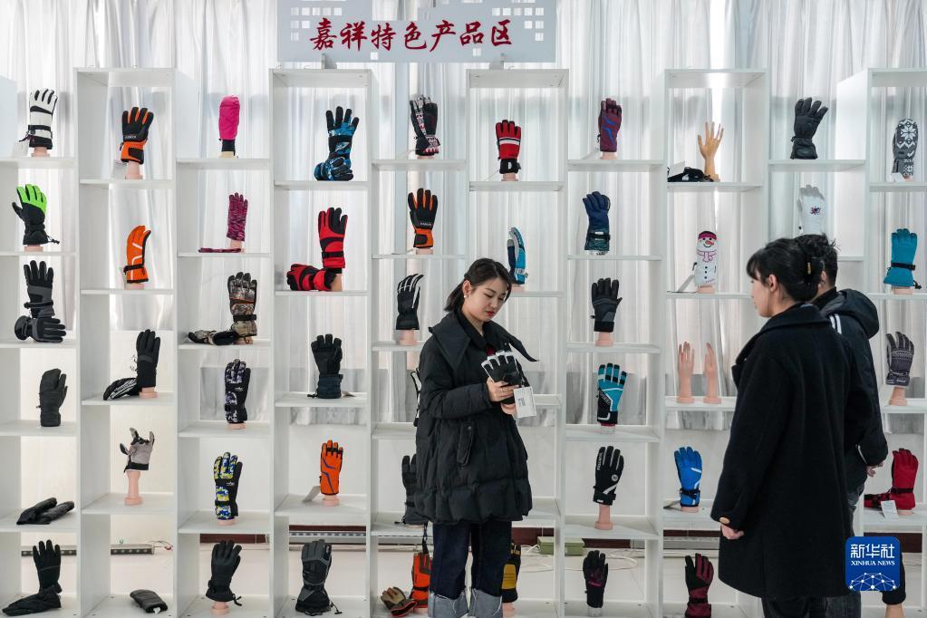 2月23日,在嘉祥县的一家手套生产企业,员工向客户介绍手套新品。