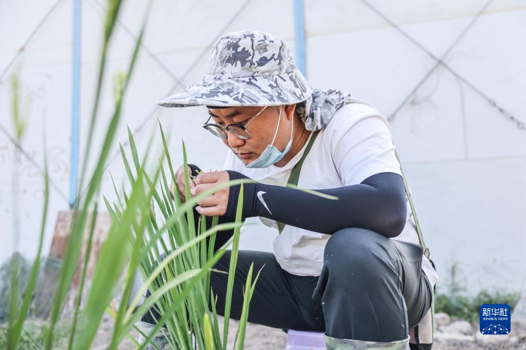 2月22日,青岛海水稻研究发展中心的科研人员在海南三亚的国家南繁科研育种基地里做水稻杂交实验。