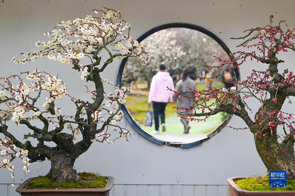 2月18日,游客在江苏省第二十七届苏州太湖梅花节香雪海梅花盆景展上欣赏梅花。