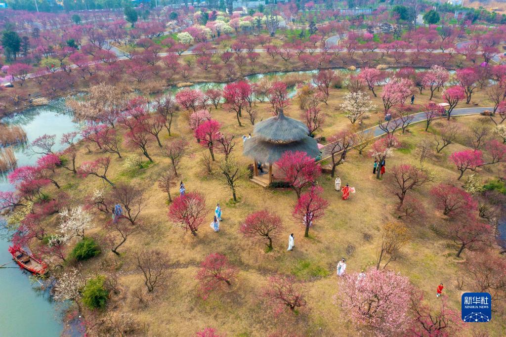 2月18日,游客在浙江省湖州市长兴县龙之梦东方盆景园赏梅(无人机照片)。