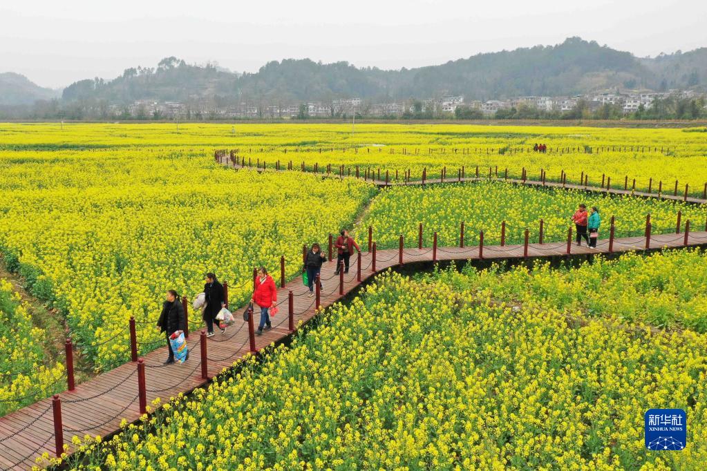 2月20日,游客在贵州省平塘县平舟镇京舟村油菜花田游玩(无人机照片)。