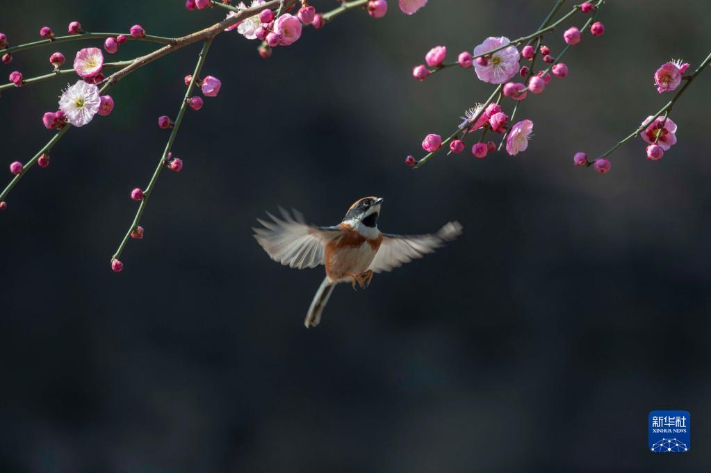 2月18日,在江苏省无锡市管社山庄,一只小鸟在梅花丛中飞舞。