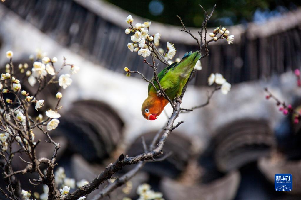 2月20日,一只小鸟落在南京梅花山的花枝上。