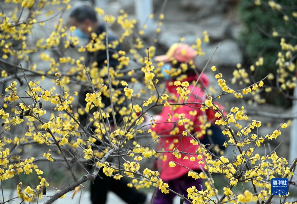 2月23日,市民在河北省石家庄市平安公园腊梅园散步。