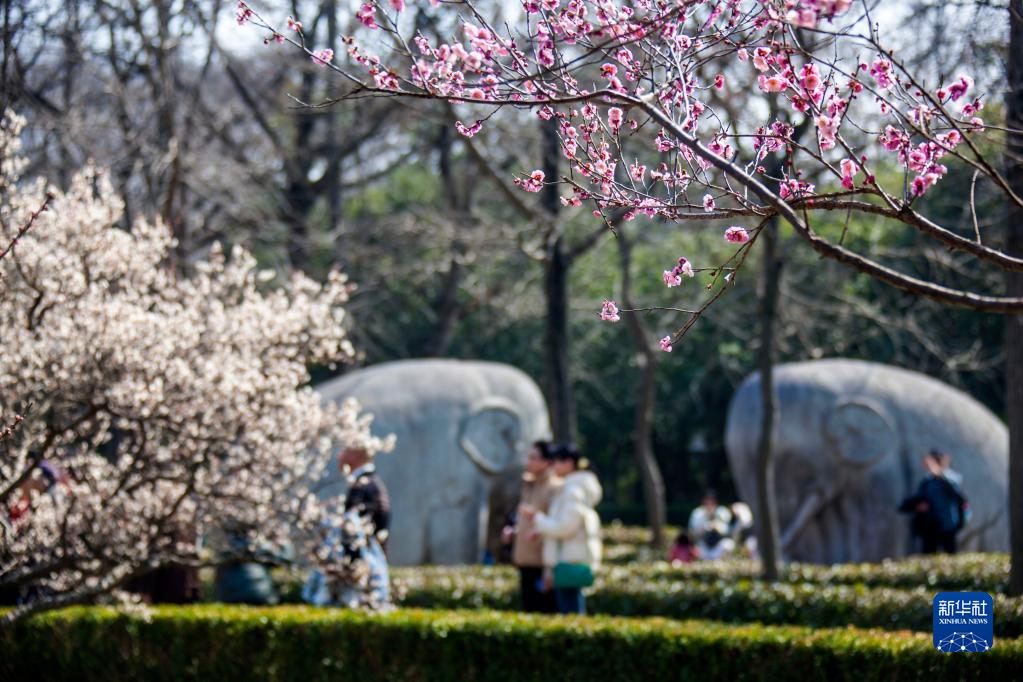 2月20日,游人在南京明孝陵景区神道旁赏花游玩。