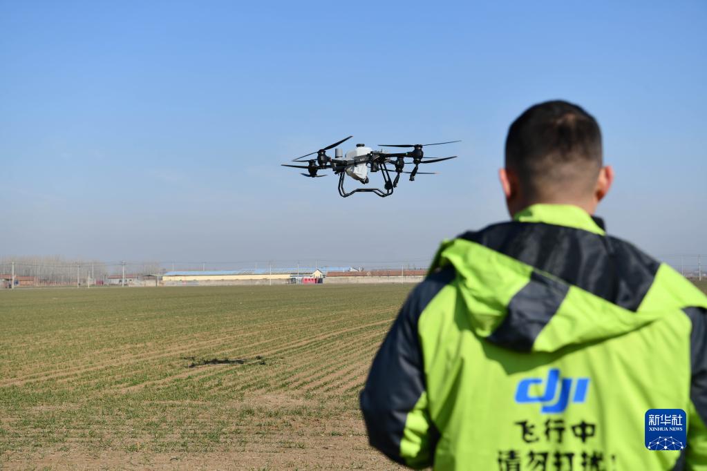2月23日,在邹平市长山镇八方农场活动现场,农机手进行无人机智慧喷洒作业演示。