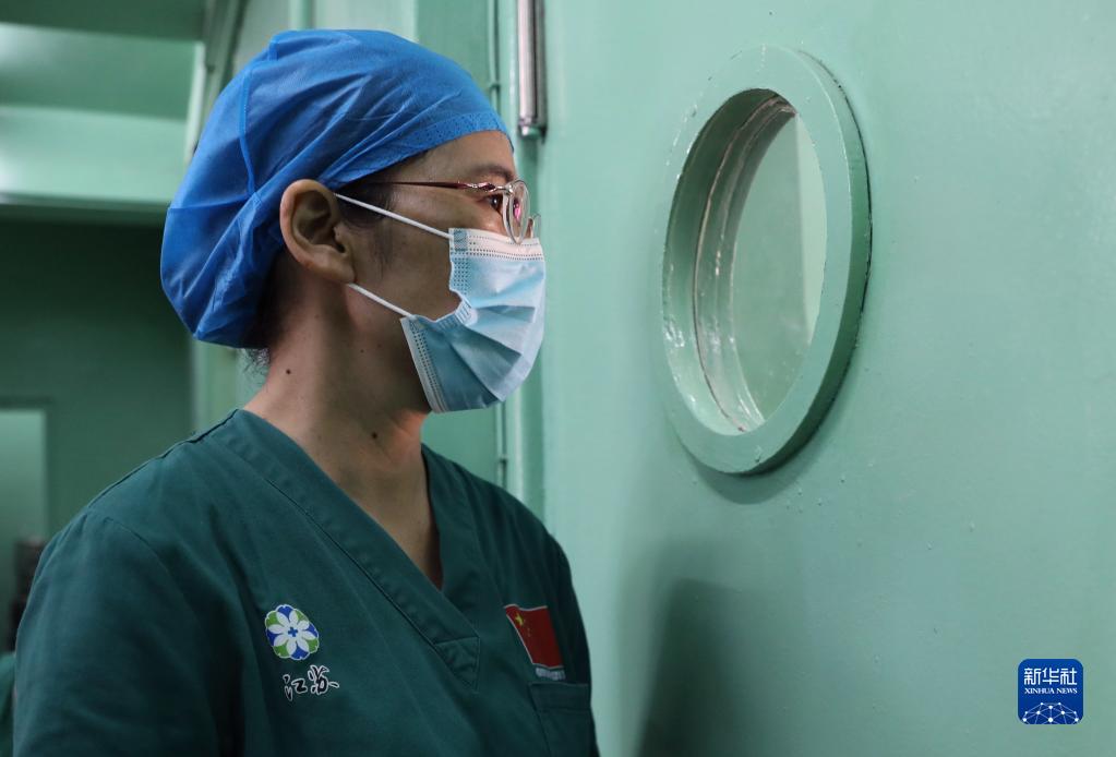 2月22日,在坦桑尼亚桑给巴尔岛纳兹莫加医院,妇产科医生徐信兰注视着正在进行手术的手术室。