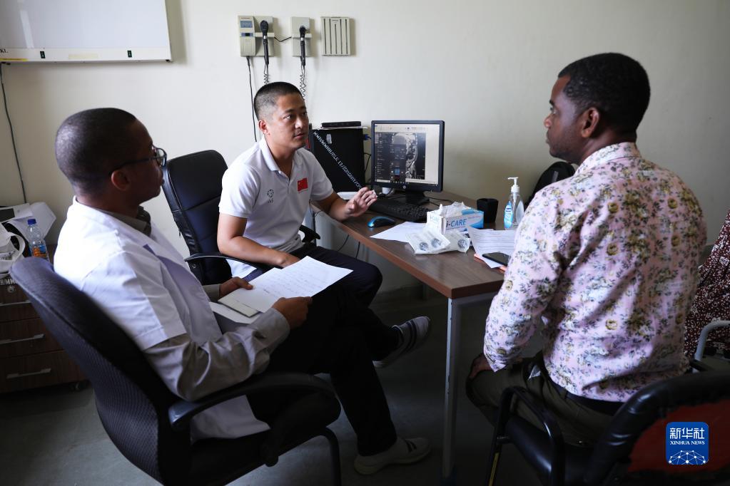2月22日,在坦桑尼亚桑给巴尔岛纳兹莫加医院,泌尿外科医生郭伟(左二)给病人看病。