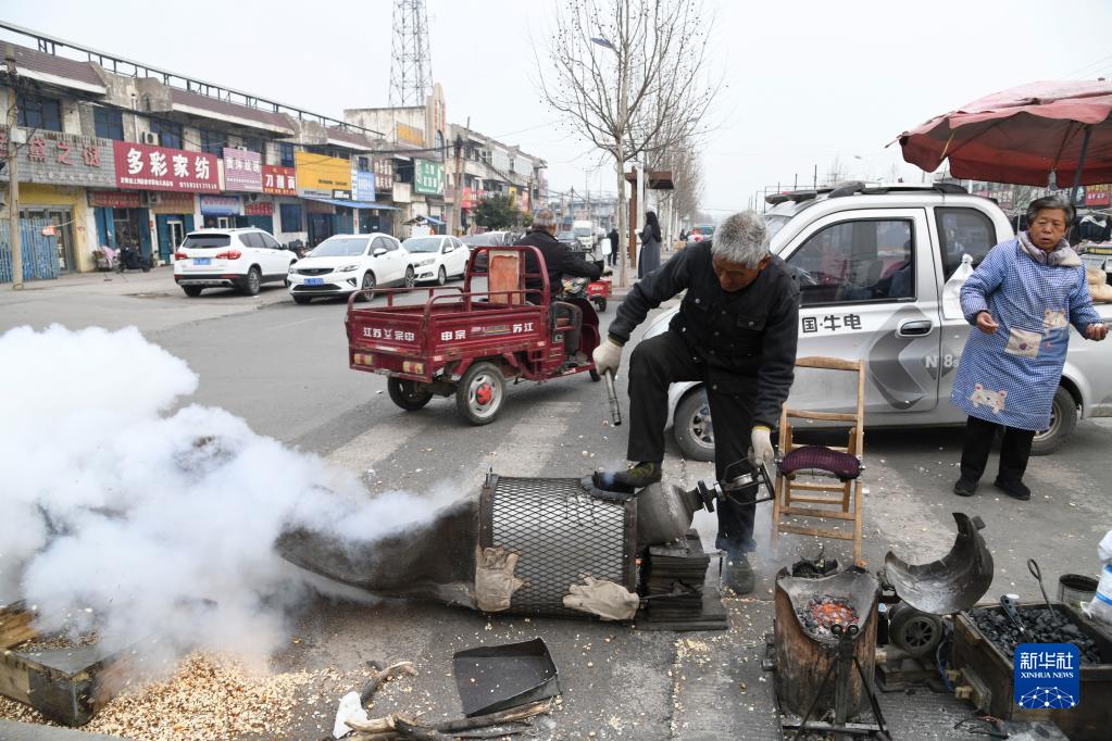 2月23日,在河南省济源市五龙口镇尚庄村集市上,商贩在崩爆米花。