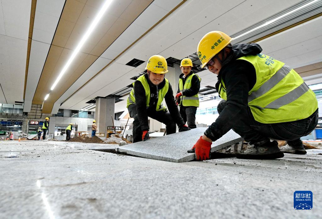 2月21日,中铁建工集团有限公司施工人员在新建福厦铁路福州南站铺设地板。