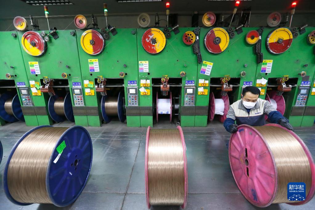 2月23日,在位于青岛市即墨区科技创新园的青岛高丽钢线有限公司,工人在检查胎圈钢丝质量。