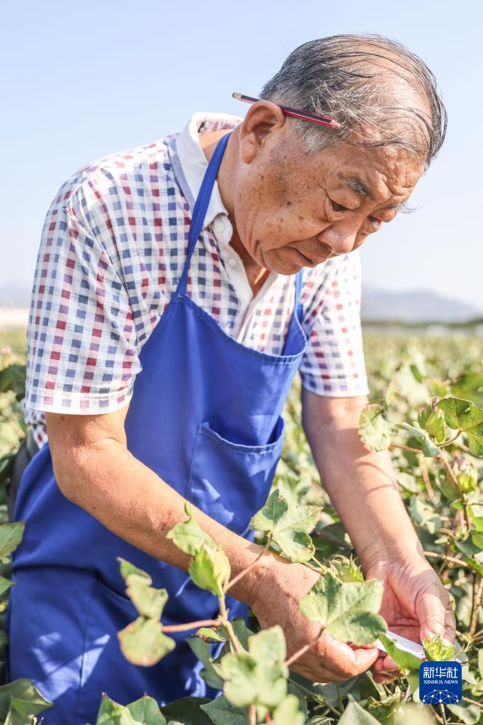 2月23日,在三亚的国家南繁科研育种基地里,棉花育种专家赵国忠在观察棉花的长势。