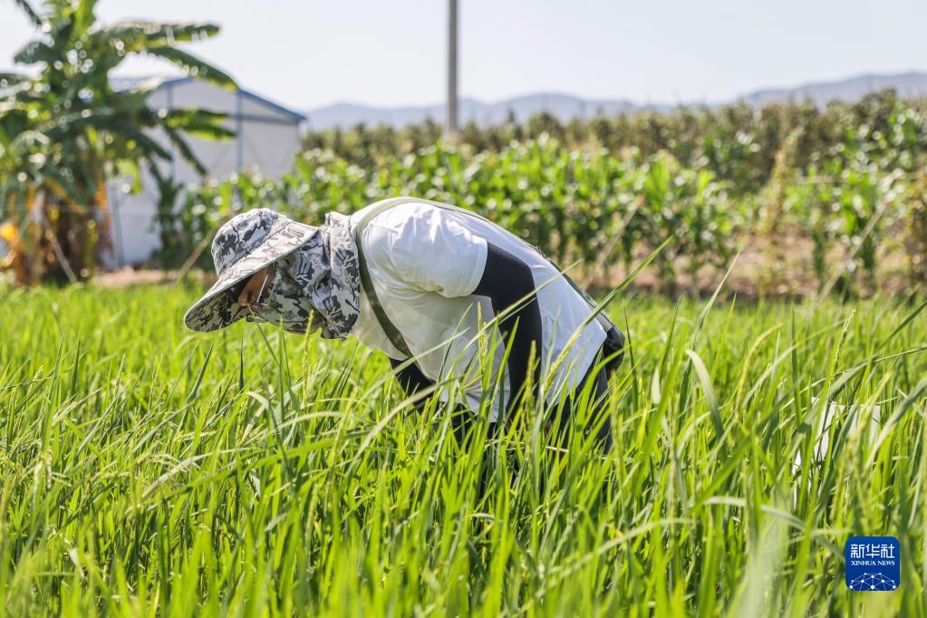 2月22日,青岛海水稻研究发展中心的科研人员殷会德在三亚的国家南繁科研育种基地里观察水稻的长势。