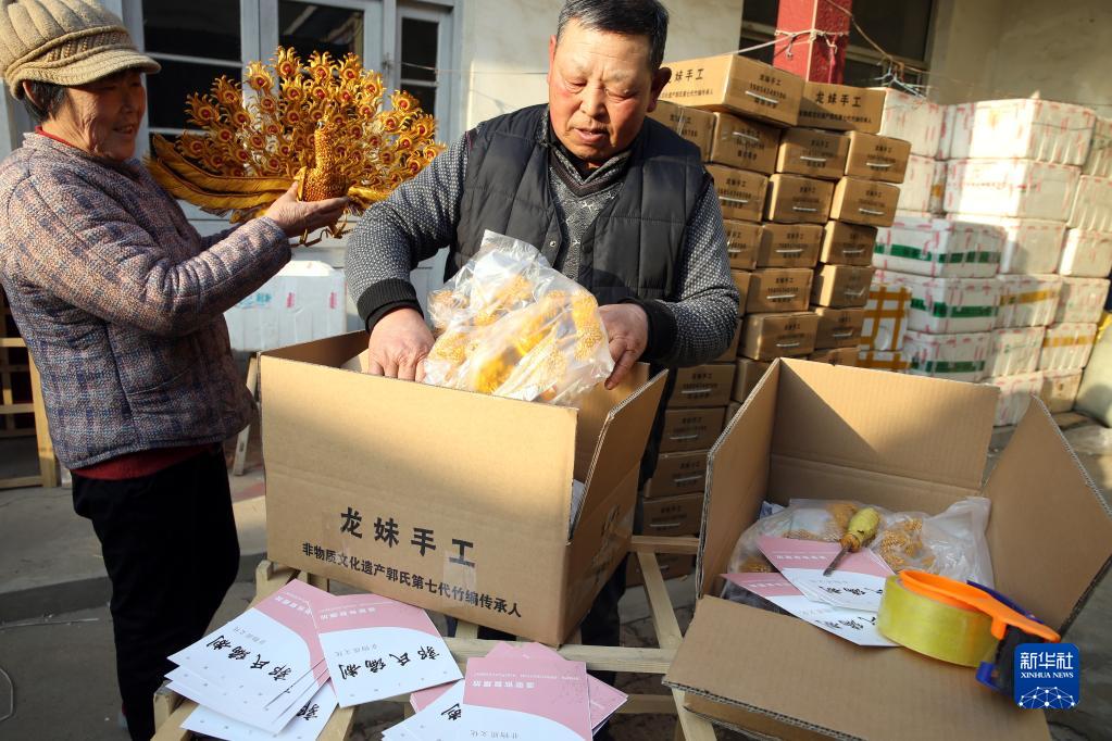 2月23日,滨州市沾化区下洼镇村民安春华(右)夫妇在打包铝编工艺品,准备寄出。