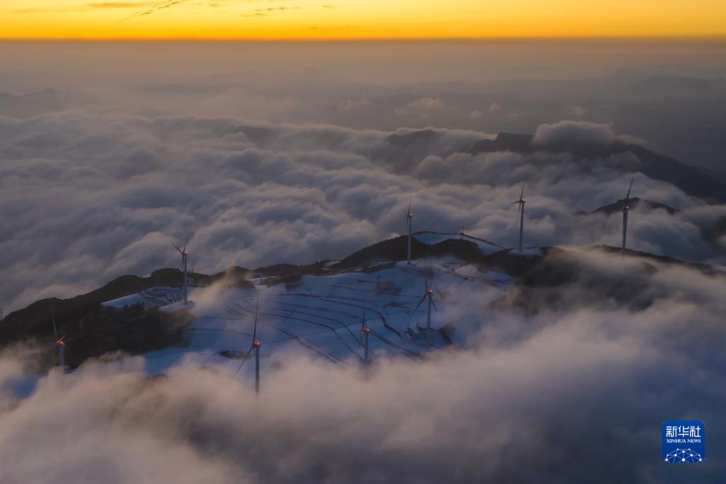 一场春雪过后,湖北省宜昌市秭归县云台荒风力发电场银装素裹,风电机组在云海中旋转,美景如画。
