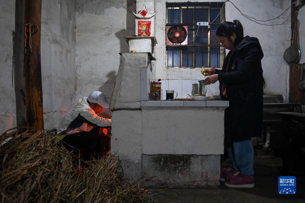 2月24日清晨,罗书坚(左)在出门跑步前帮助妻子烧火做早餐。